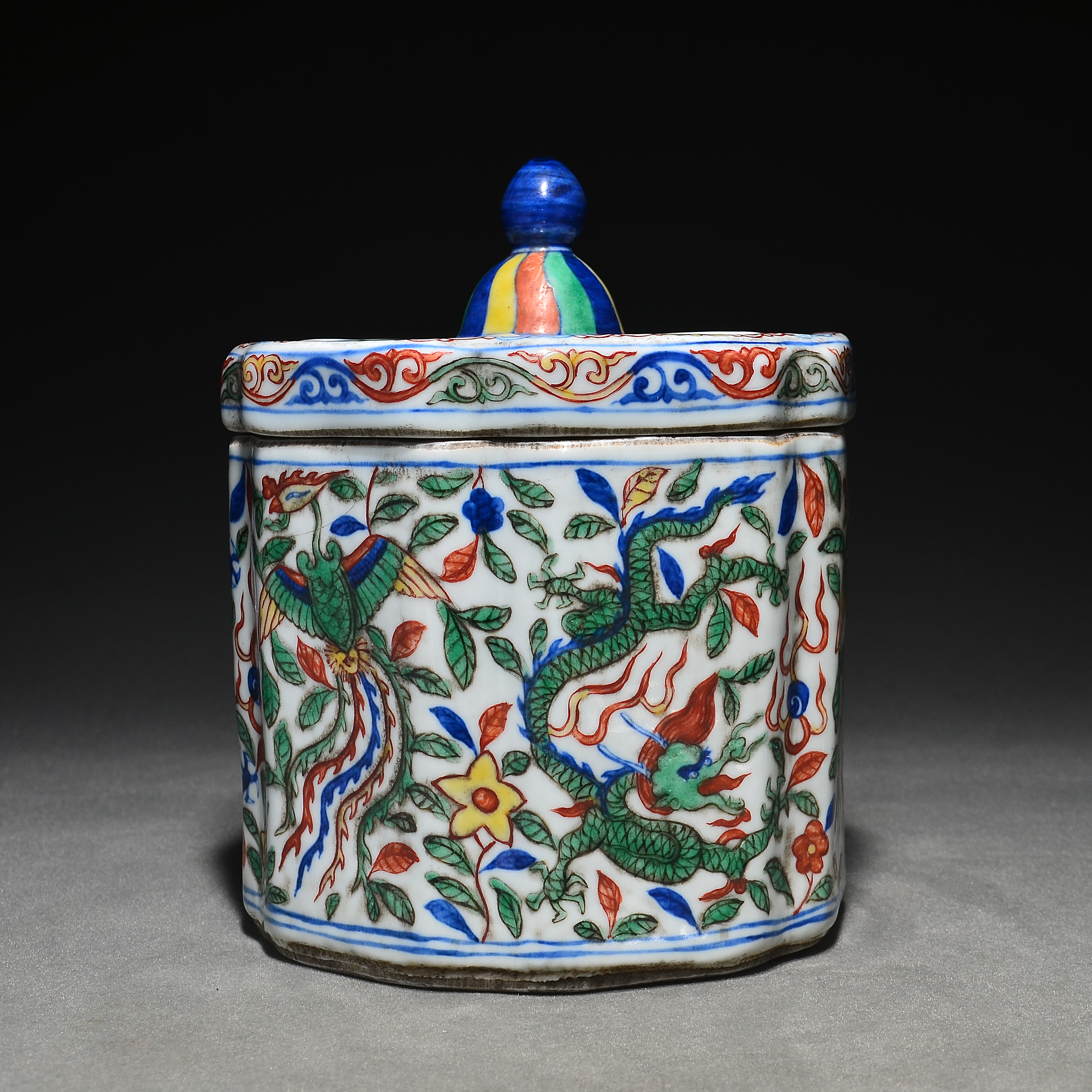 4625 青花五彩瓜棱型龙凤呈祥纹盖罐