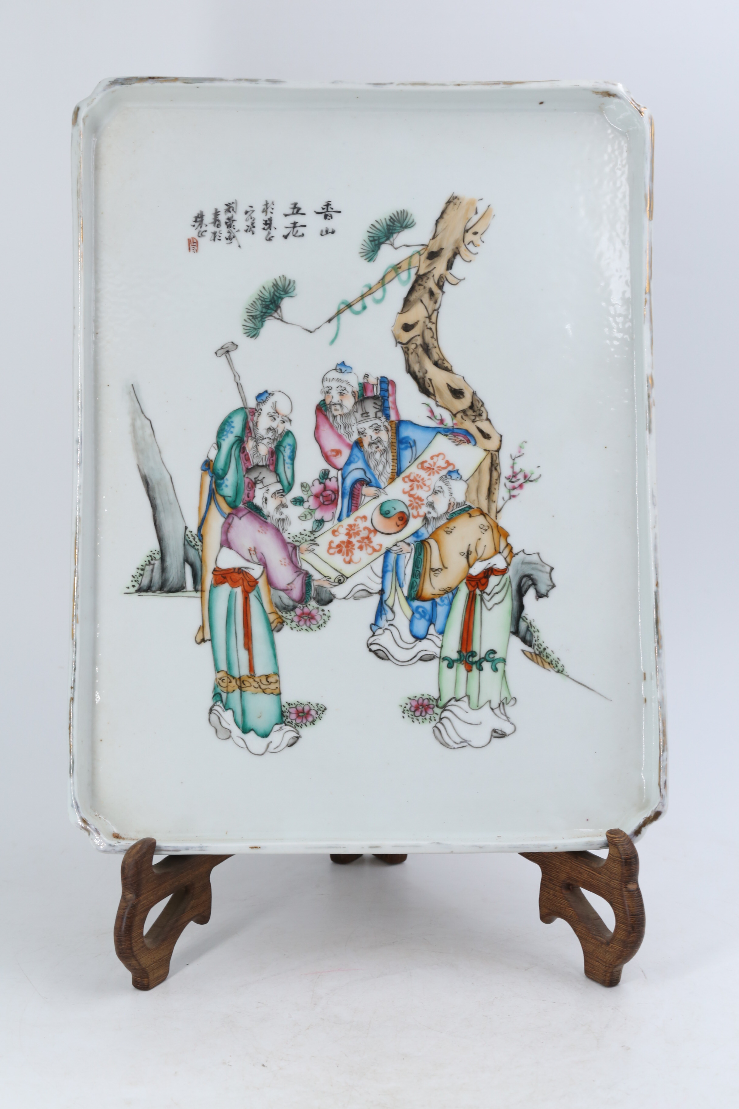 3222 刘荣盛作粉彩香山五老图倭角长方形呈盘