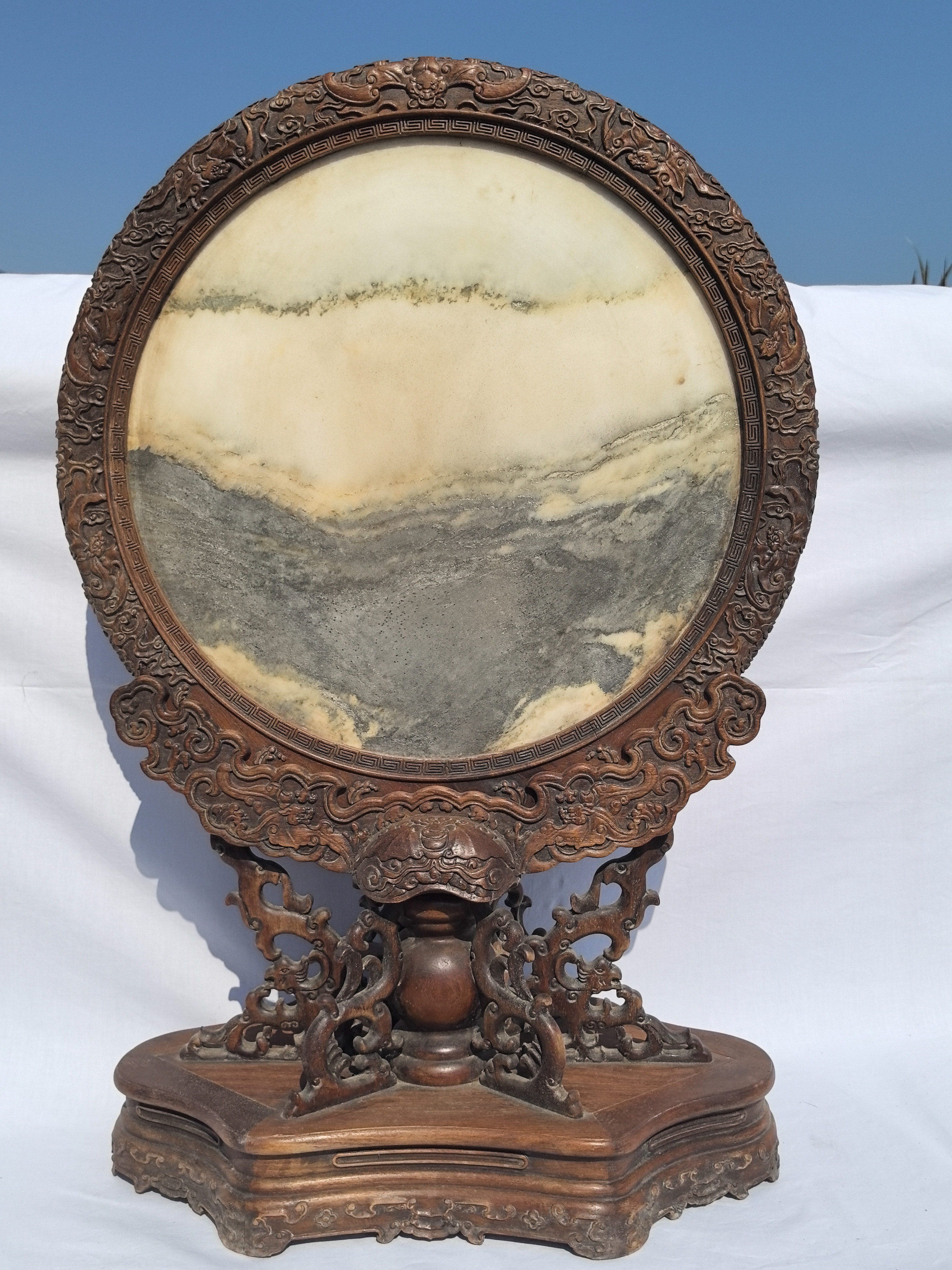1002 海黄螭龙座九蝠回纹“福在眼前”云石座屏