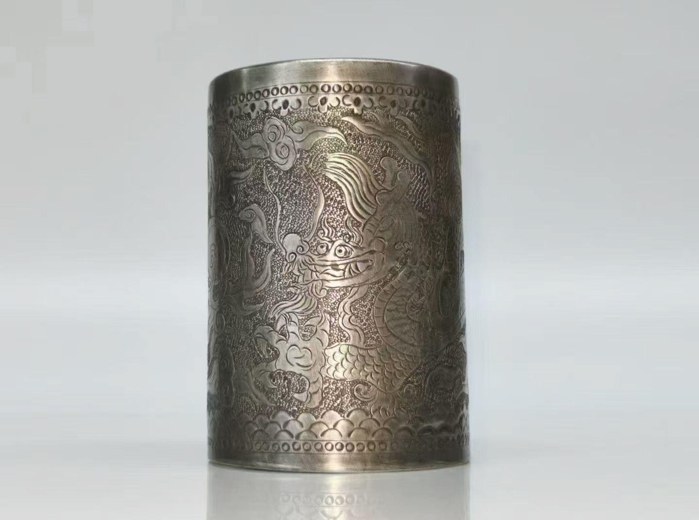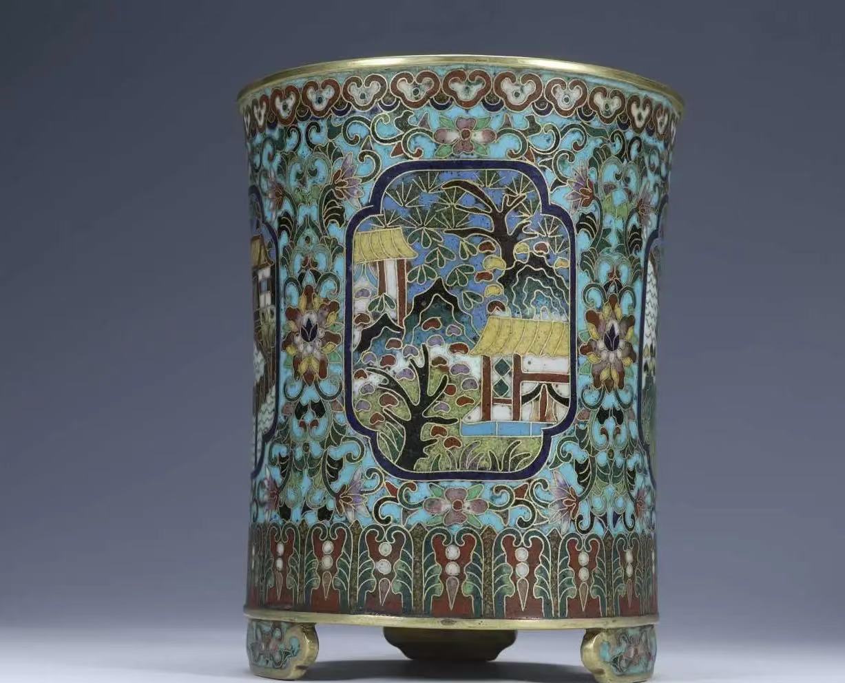 1018 景泰蓝掐丝鎏金四面开窗山水人物笔筒