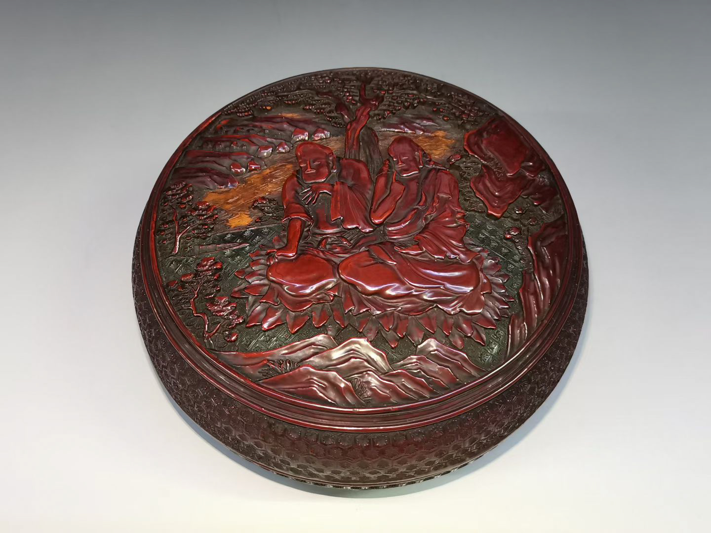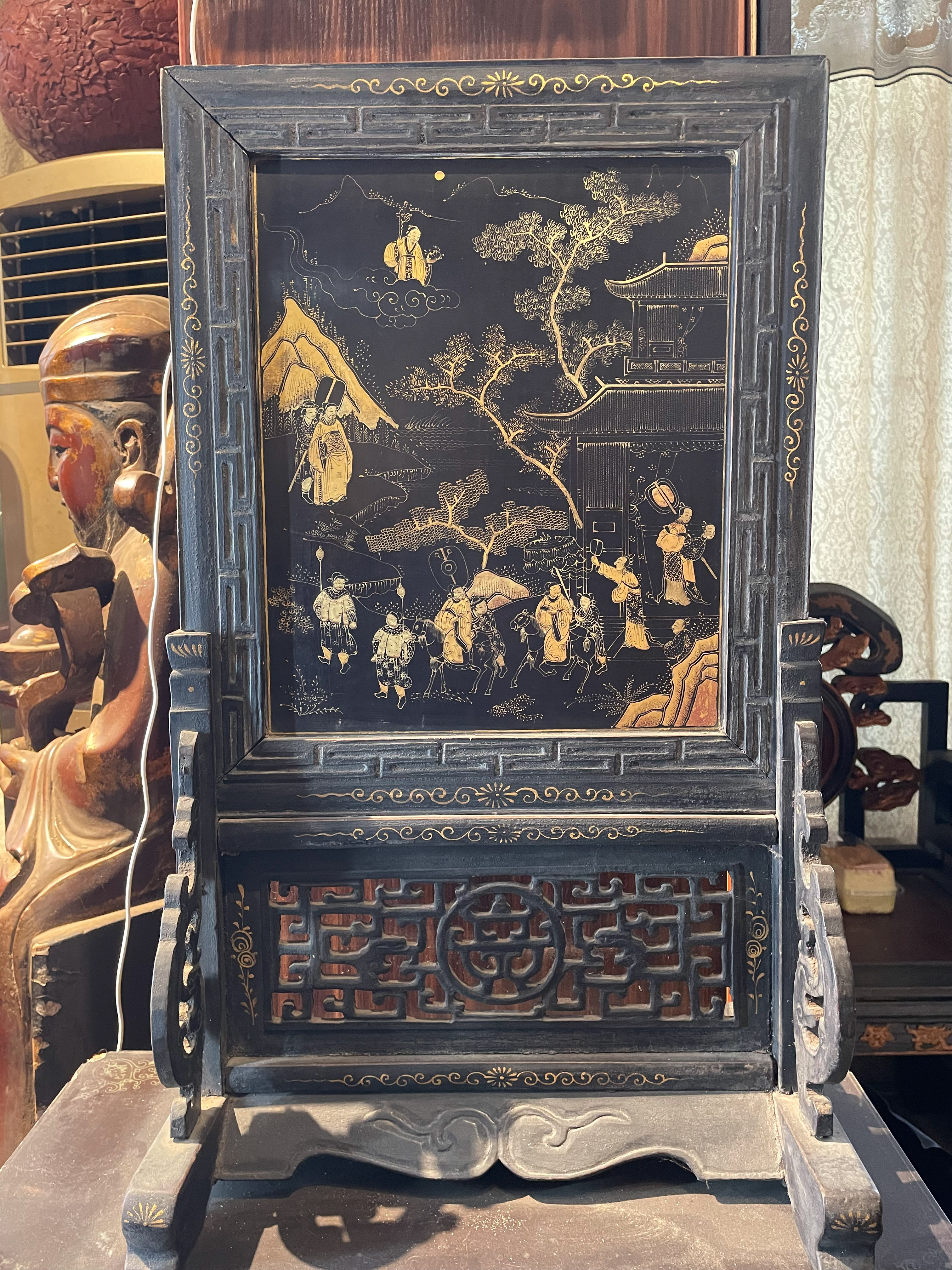 1096 大漆戗金加彩清供图、五福捧寿纹插屏