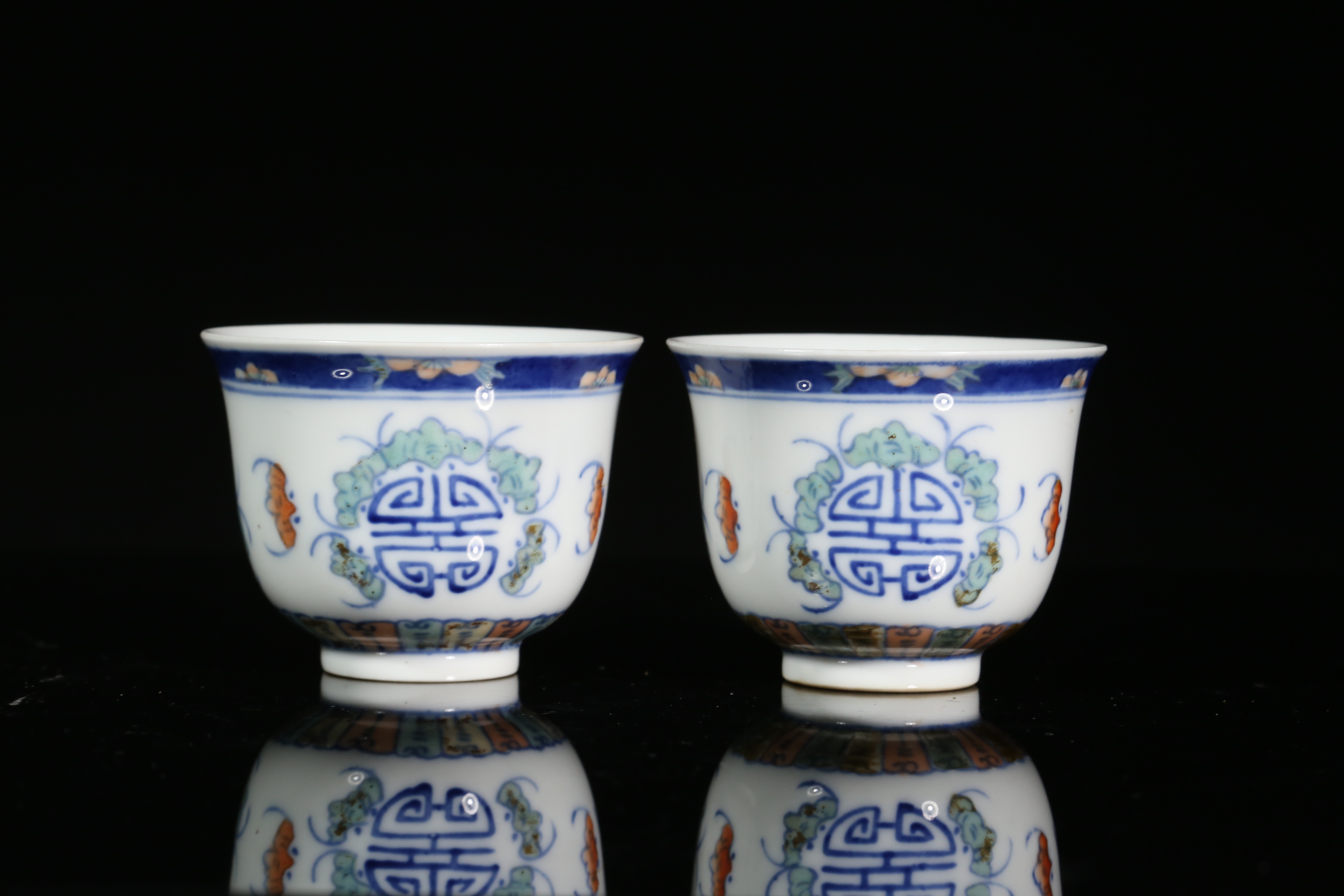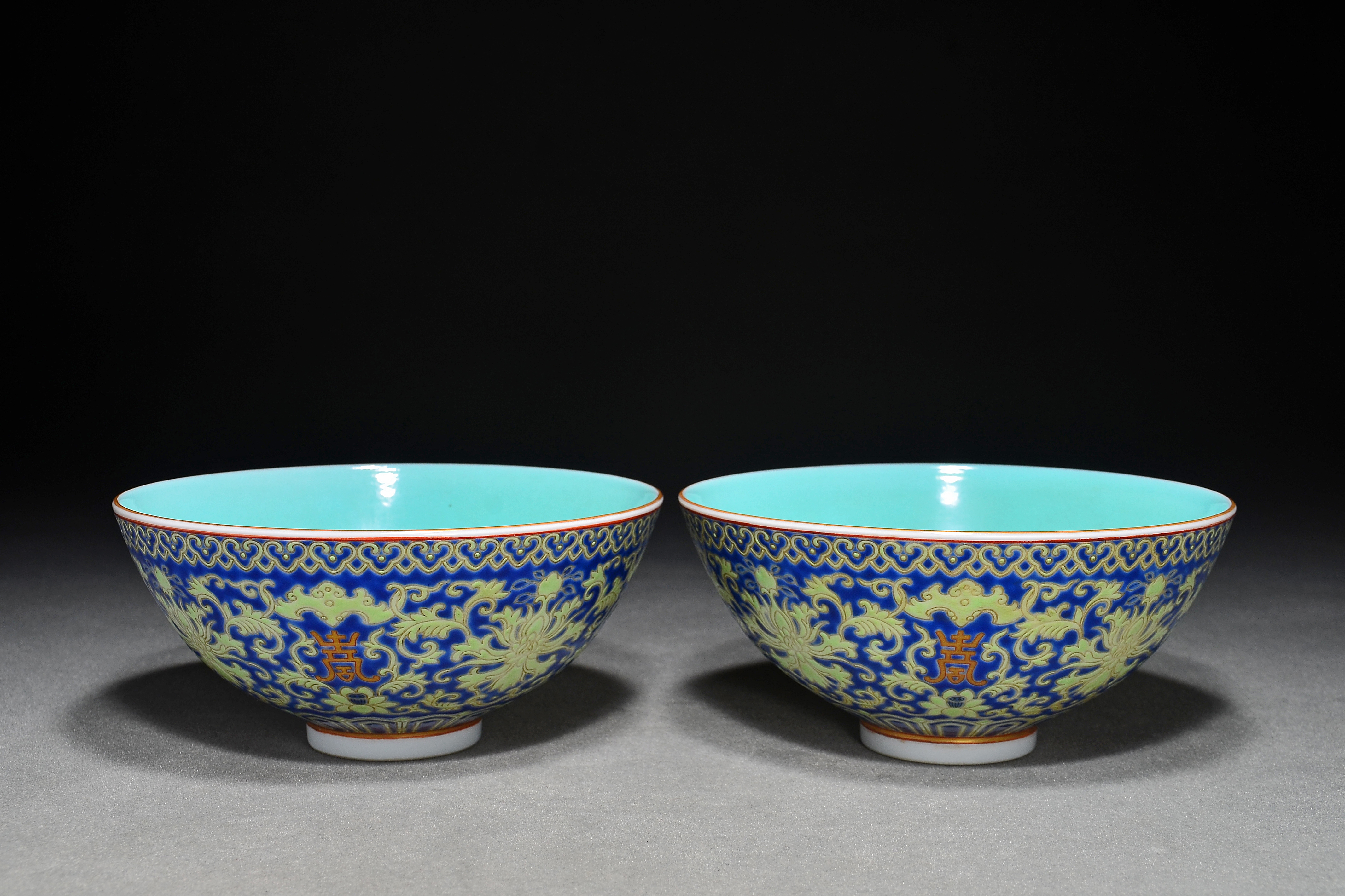 2510 蓝地绿彩莲绵寿长纹碗一对