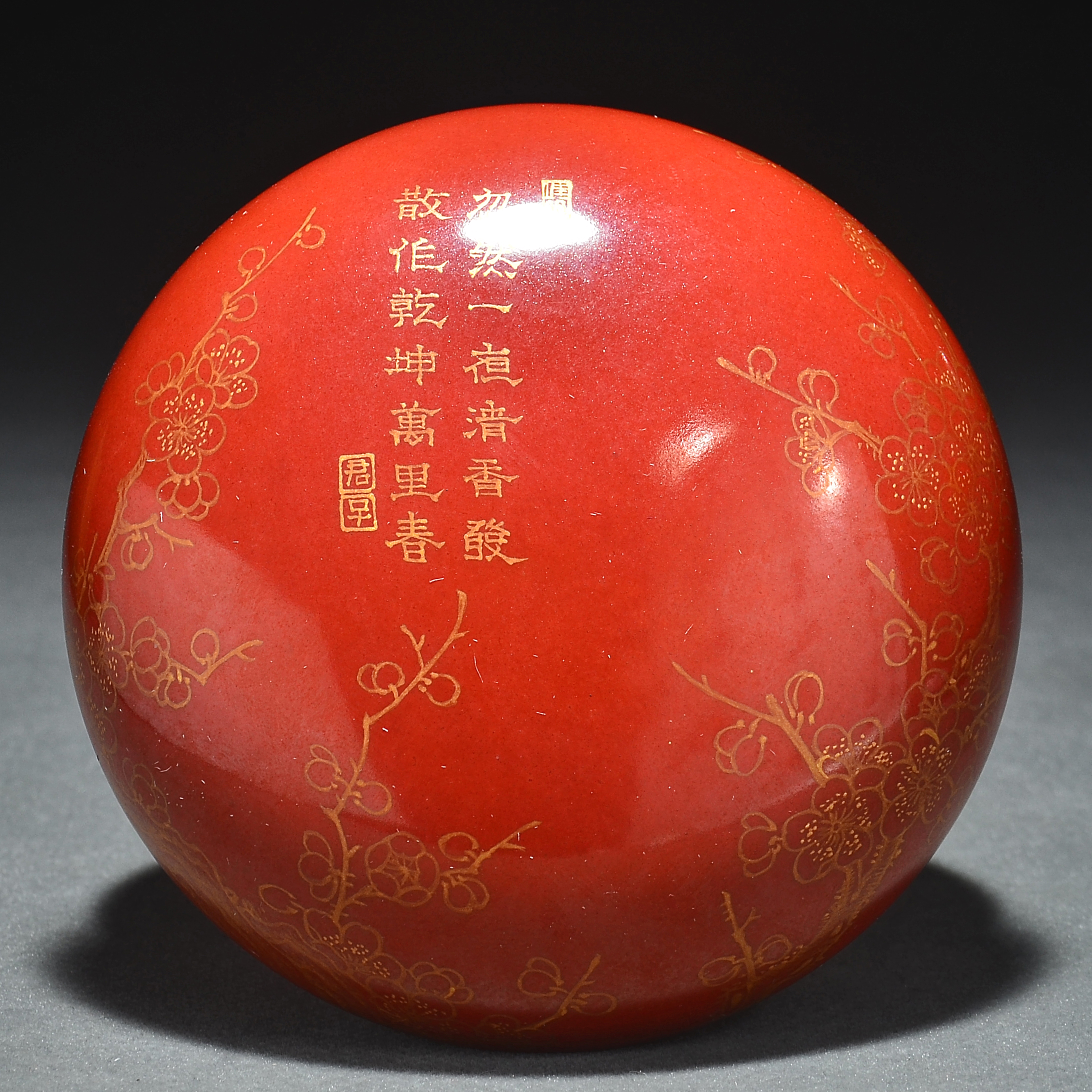 2569 矾红地描金御题诗文梅花图印盒