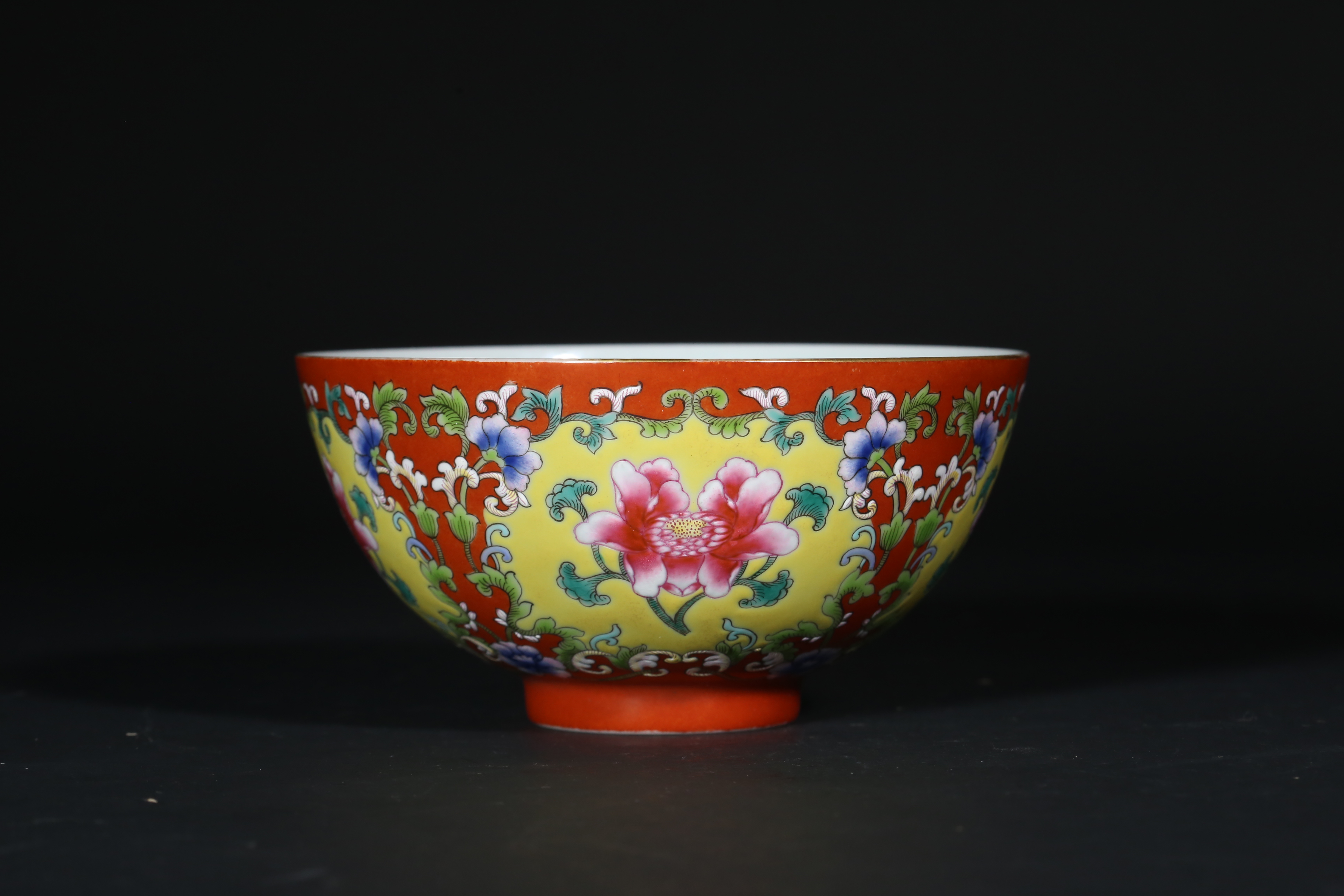 2585 珊瑚红地粉彩开光花卉纹碗