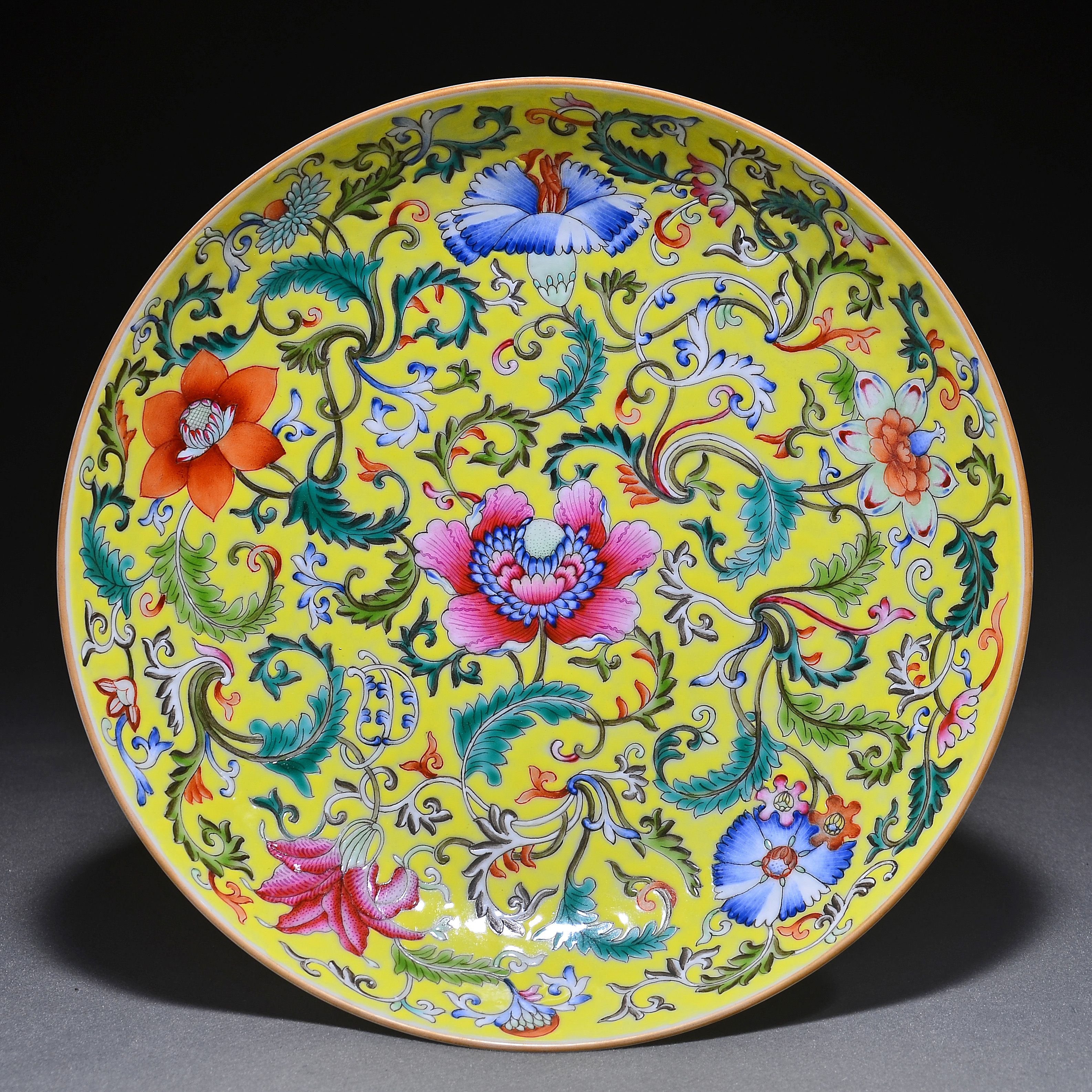 1180 黄地粉彩缠枝花卉纹盘