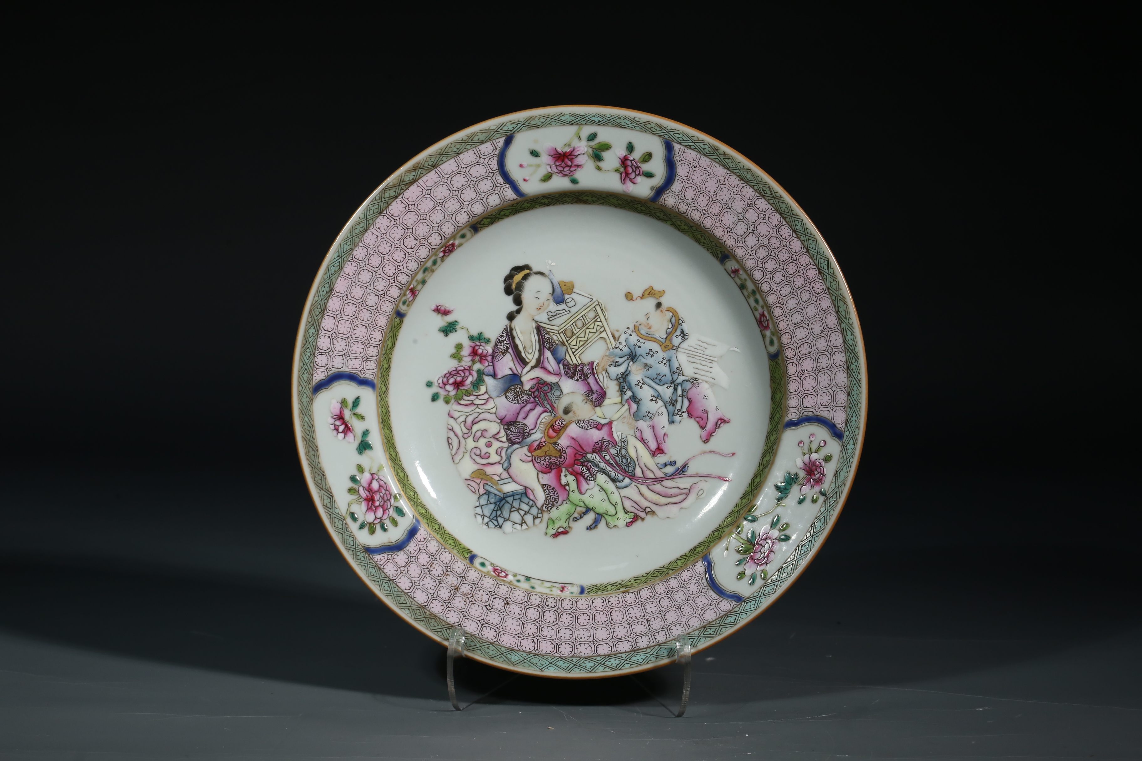 1511 粉彩锦地教子图纹盘