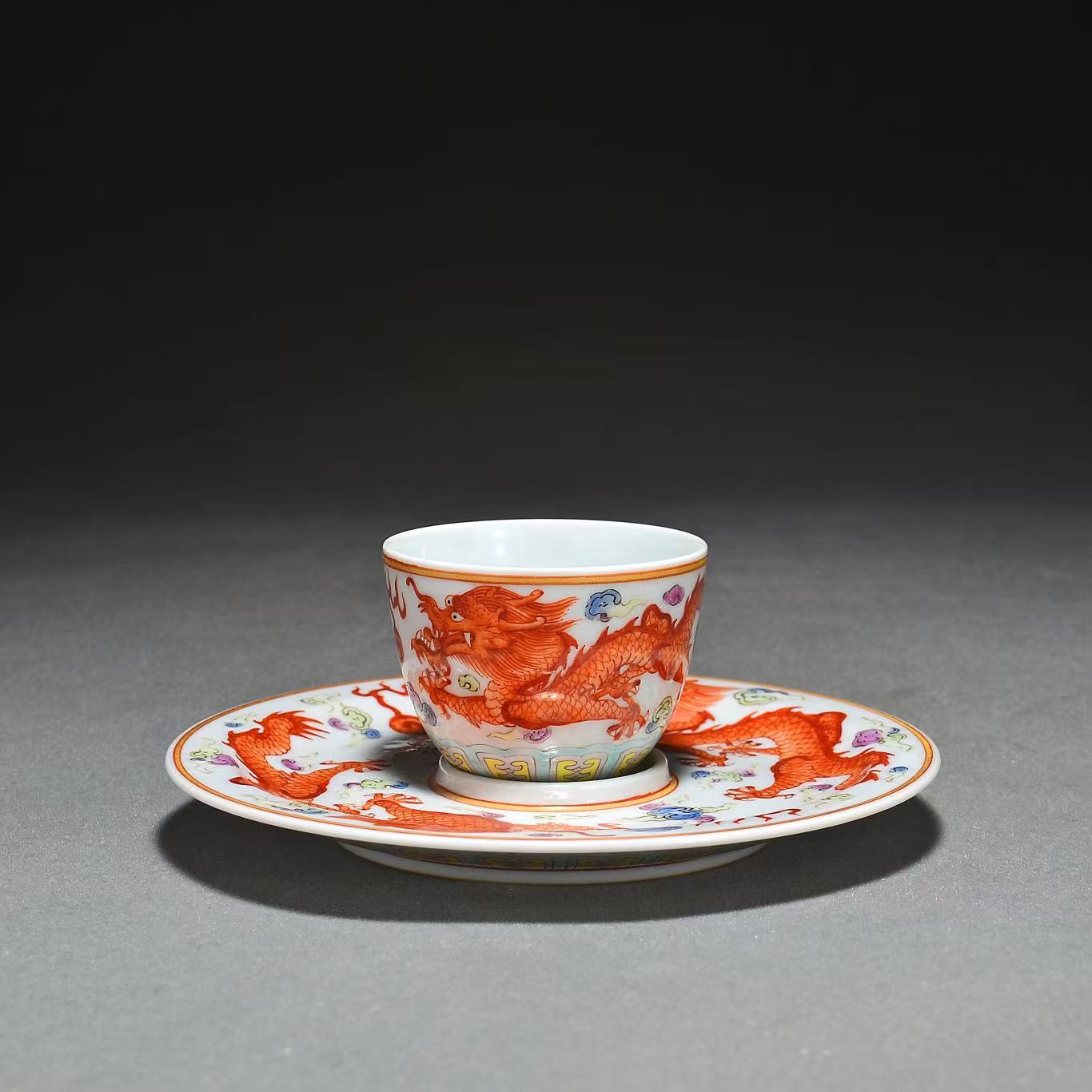 1519 吉祥如意款粉彩矾红云龙纹茶杯茶托一套