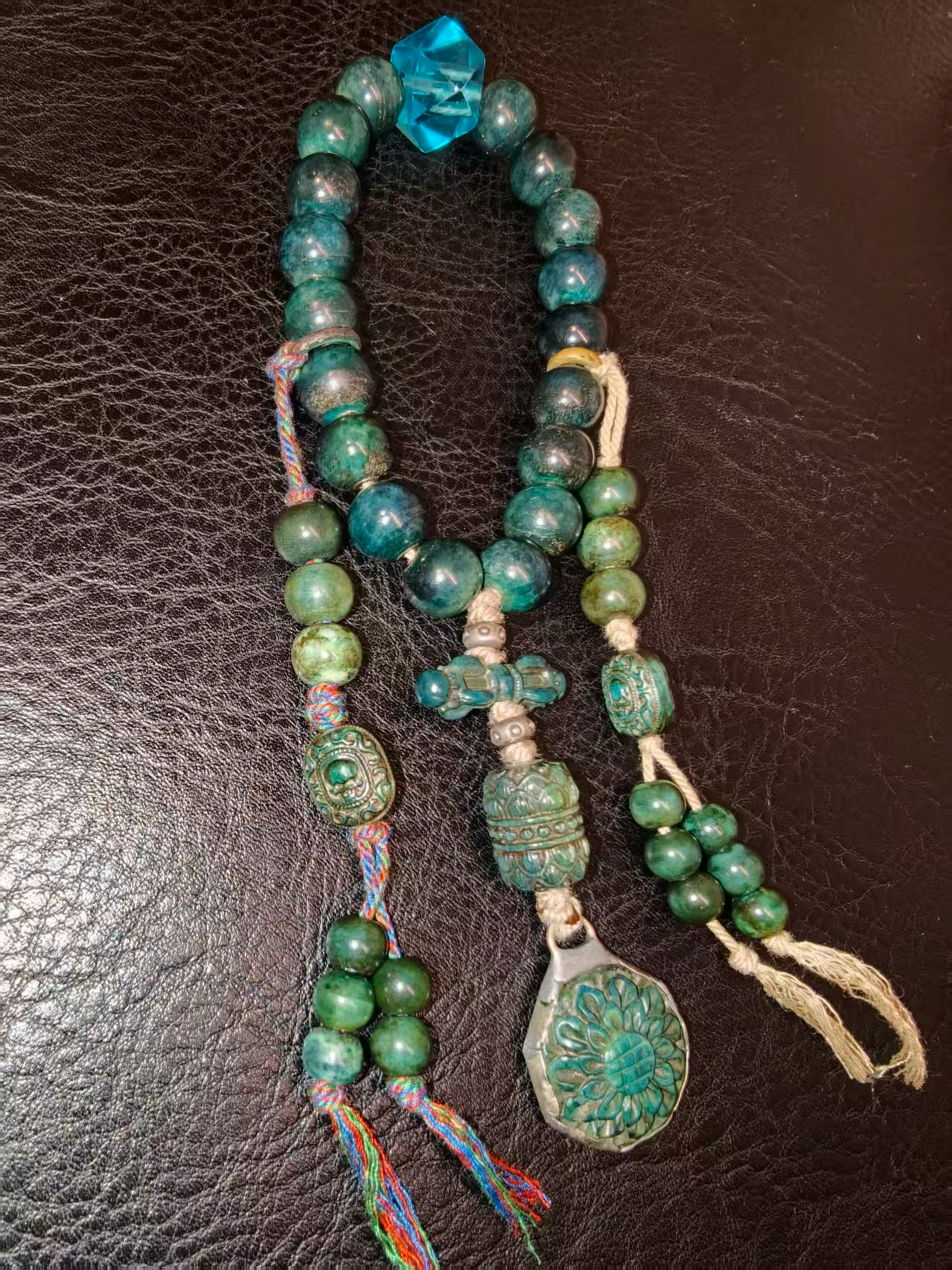 2266 甘南红佛手珠、天河石管、老绿松石珠、红玛瑙双孔方珠多宝串