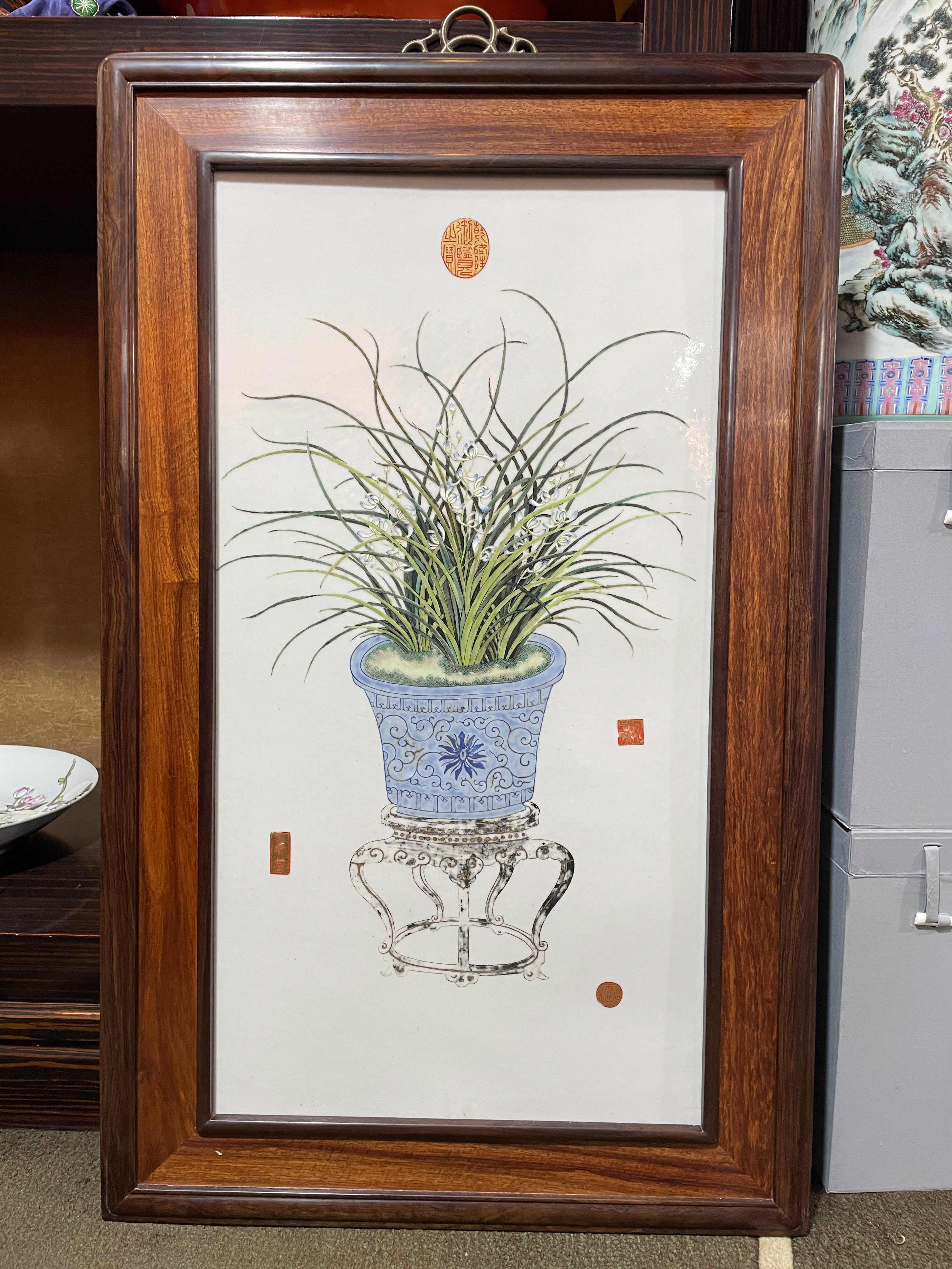 2391 粉彩兰花盆景瓷挂屏
