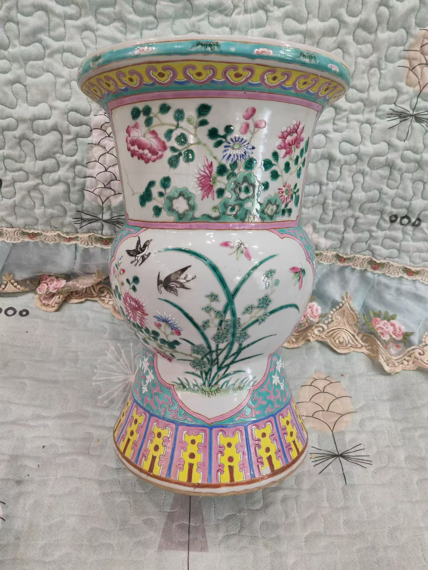 2400 细路粉彩开窗花鸟纹盘口尊